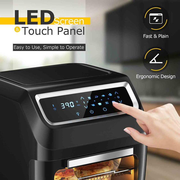 Smart LED Interface: The air fryer is equipped with an LED touch screen that simplifies setting adjustments with its intuitive interface. The display is ergonomically tilted, ensuring ease of use and readability during cooking.