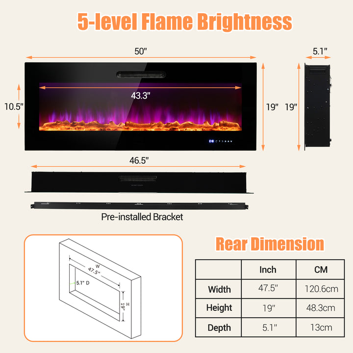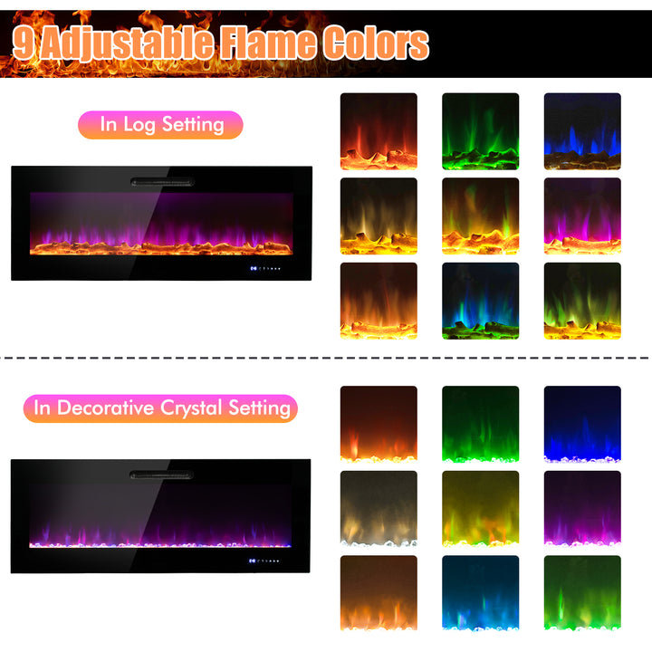This versatile electric fireplace offers two installation options¡ªrecessed or wall-mounted¡ªmaking it suitable for various spaces. Featuring 9 flame colors, 5 brightness levels, and energy-efficient heating (750W/1500W, 5,000 BTU), it warms up to 400 sq. ft. The touch screen and remote control ensure convenience, while safety features like overheat protection and a child lock make it family-friendly.