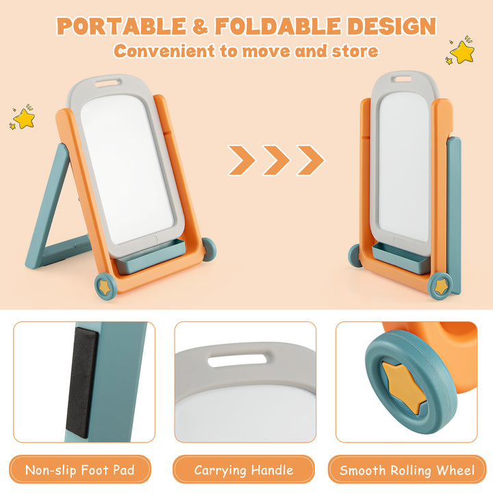 Portable and Foldable Design: Designed for convenience, it folds into a compact size for easy storage and mobility. Rolling wheels and carrying handles on both the easel and chair make it effortlessly portable.