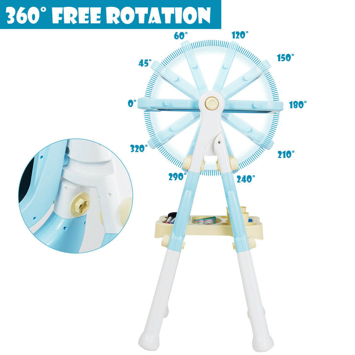 360-Degree Rotate Drawing Board: The easel boasts a dual-sided design with a magnetic whiteboard on one side and a chalkboard on the other, easily switchable at any angle thanks to its 360-degree rotation. Magnetic surfaces allow for the attachment of an eraser and magnetic beads, with easy cleaning to keep the creativity flowing.