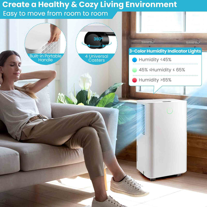 This high-efficiency dehumidifier removes up to 32 pints of water per day and adjusts humidity levels from 30% to 80%, perfect for spaces up to 1750 sq ft. Featuring 3 modes, 2 speeds, a 24-hour timer, and ultra-quiet operation at 38dB, it£ªs designed for convenience and comfort. Easy portability, two drainage options, and child-lock ensure hassle-free, safe use.