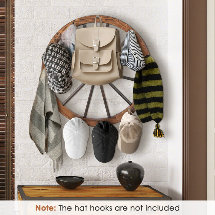 Add rustic charm to your home or garden with these decorative wooden wagon wheels. Crafted from premium fir wood with a carbonized finish and varnish for durability, they are built to withstand outdoor use. Featuring a sturdy metal rim, 12-rod design, and natural wood grain, these versatile wheels double as decor pieces or functional elements like chandelier holders.