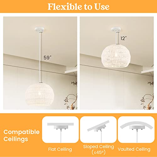 This elegant pendant light features a hand-woven paper lampshade with rustproof metal rings, creating a warm, natural ambiance. With a height-adjustable rope, durable materials, and easy installation, it fits any room and is ideal for various ceiling types. Perfect for adding charm and brightness to your space.