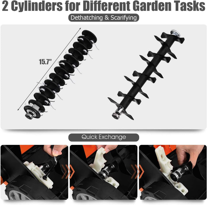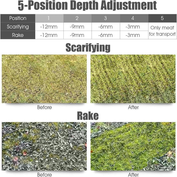 Versatile 2-in-1 Functionality: Comes with both a dethatching blade and a scarifying blade, adjustable through 5 depth settings, for targeted lawn care and healthier grass.