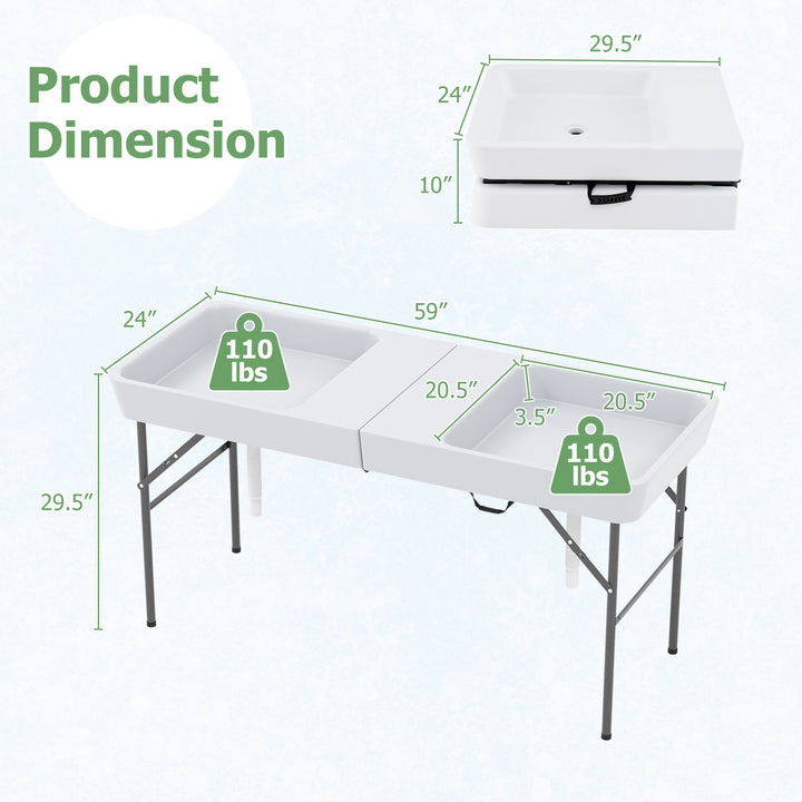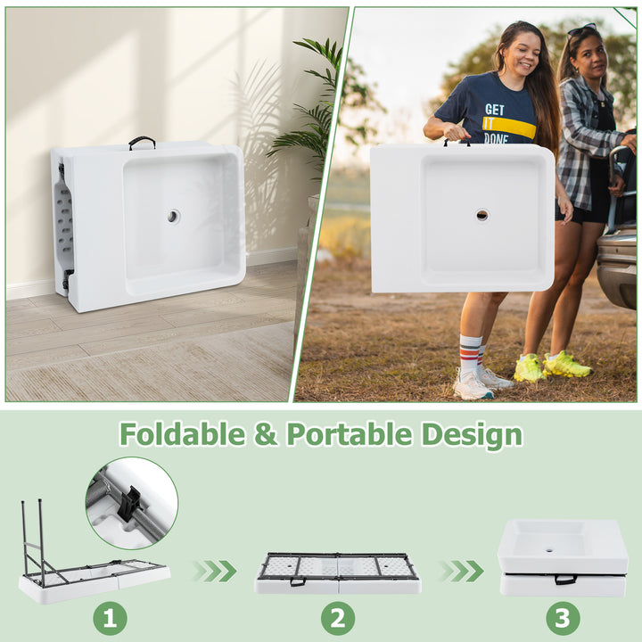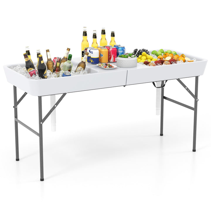This folding ice cooler table features double sinks for separating food and drinks, with a durable HDPE tabletop and H-shaped metal frame that supports up to 220 lbs. The detachable skirt hides drainage hoses, and its foldable design and carrying strap make it perfect for outdoor parties, picnics, and more.