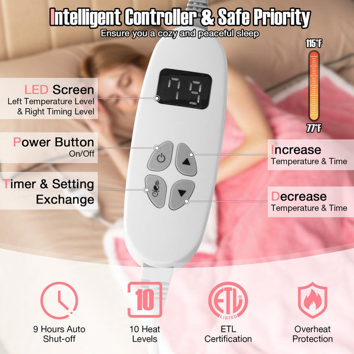 Tailored Warmth to Your Liking: The integrated intelligent controller offers unparalleled control, allowing you to finely tune the temperature across 10 levels from a gentle 77¡ãF to a snug 115¡ãF. The 9-hour auto-shutoff feature adds an extra layer of convenience, letting you drift off to sleep without a worry.