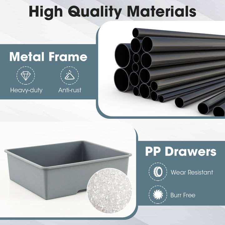 Solid and Durable Construction: Crafted from high-quality materials, this freestanding closet organizer is built to last. The robust, anti-rust metal frame ensures stability and durability, while the PP drawers feature a wear-resistant and burr-free surface for enduring use.