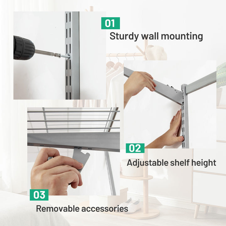Adjustable Shelving: Featuring wire mesh shelves with snap fitting, this closet kit allows for easy height adjustment, ensuring your storage can adapt to changing needs or accommodate unusually sized items without compromising stability.