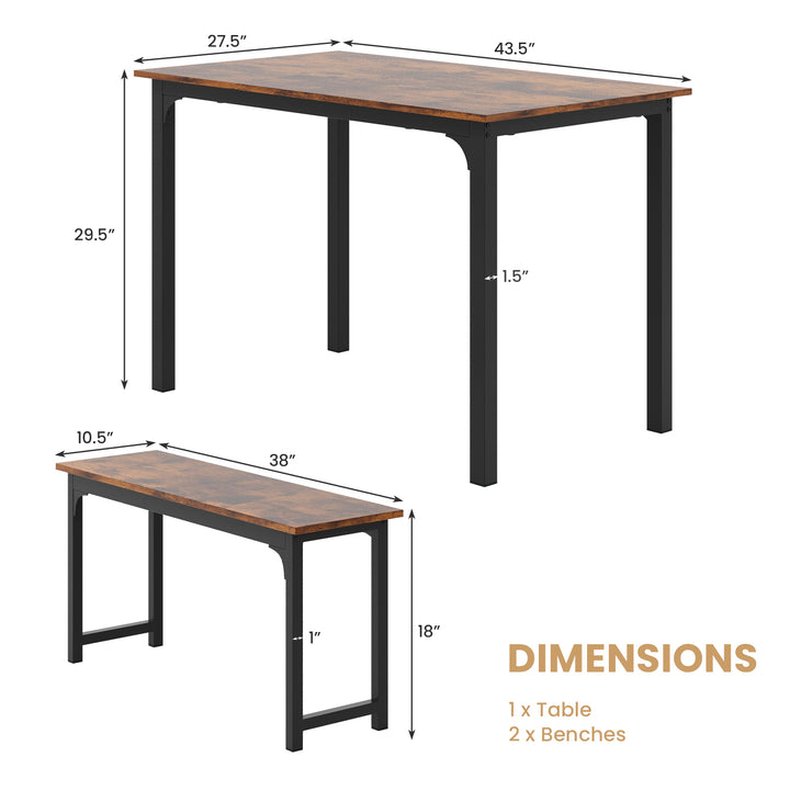 Comfortably Seats Four: The set includes a rectangular table measuring 43.5" x 27.5" x 29.5" (L x W x H) and two 38" benches, each bench capable of supporting up to 330 lbs. Its designed to accommodate a family of 4 comfortably, making it an excellent choice for everyday dining and special occasions.