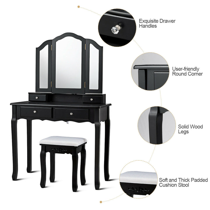Tri Folding Mirror Vanity Table Stool Set with 4 Drawers and Cushioned Stool-Black