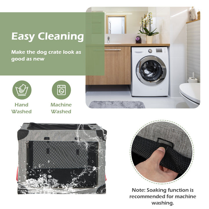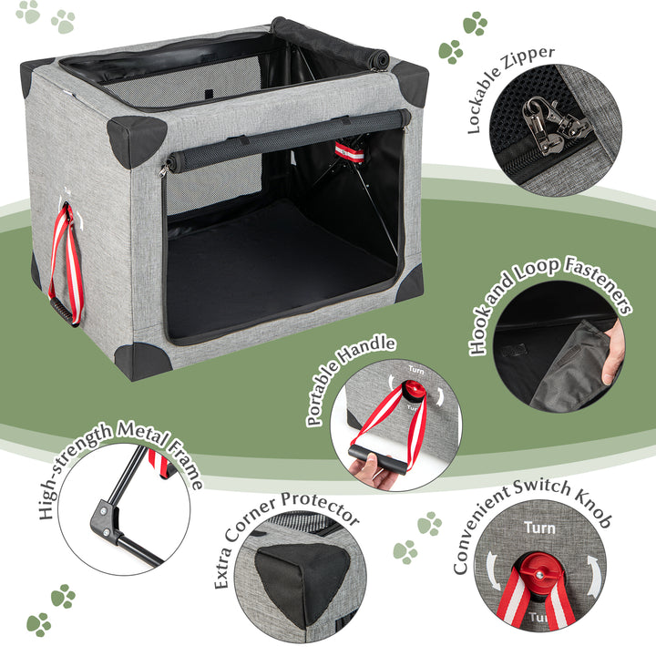 Effortless 2-Way Setup and Instant Folding: Forget the hassle of tools and complex assembly. Our soft kennel offers two simple setup methods. Pull the red straps on both sides to expand the frame or lift the crate by a strap for an instantaneous setup. When its time to pack up, a quick rotation of the side knob allows the kennel to fold into a compact size easily.
