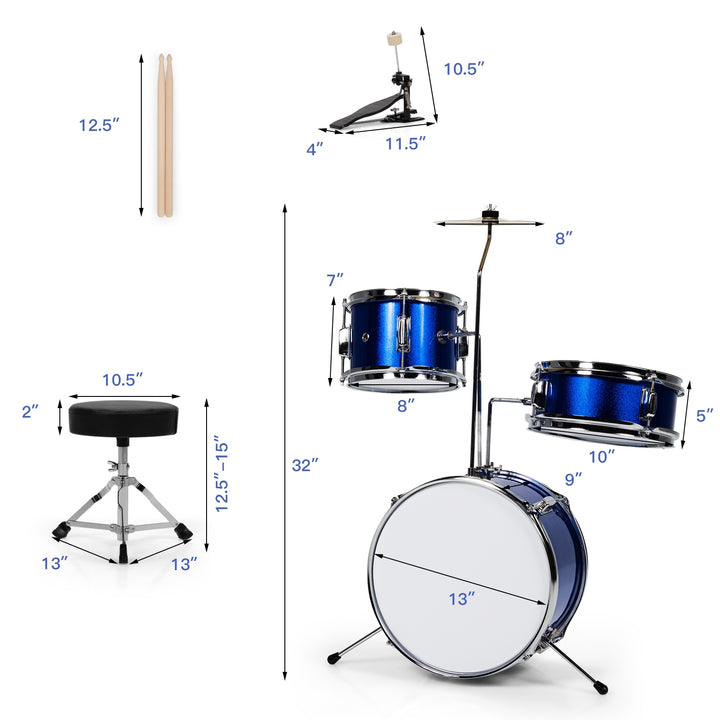Versatile Instrument Collection: This set includes a 10" crash cymbal, 8" x 7" and 10" x 7" tom drums, a 12" x 10.5" floor tom, a 10" x 6" snare, a 16" x 13" bass drum, and an 8" Hi-Hat. Its a comprehensive setup that mimics professional drum sets but is sized for younger players.