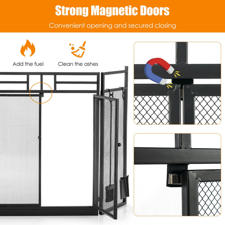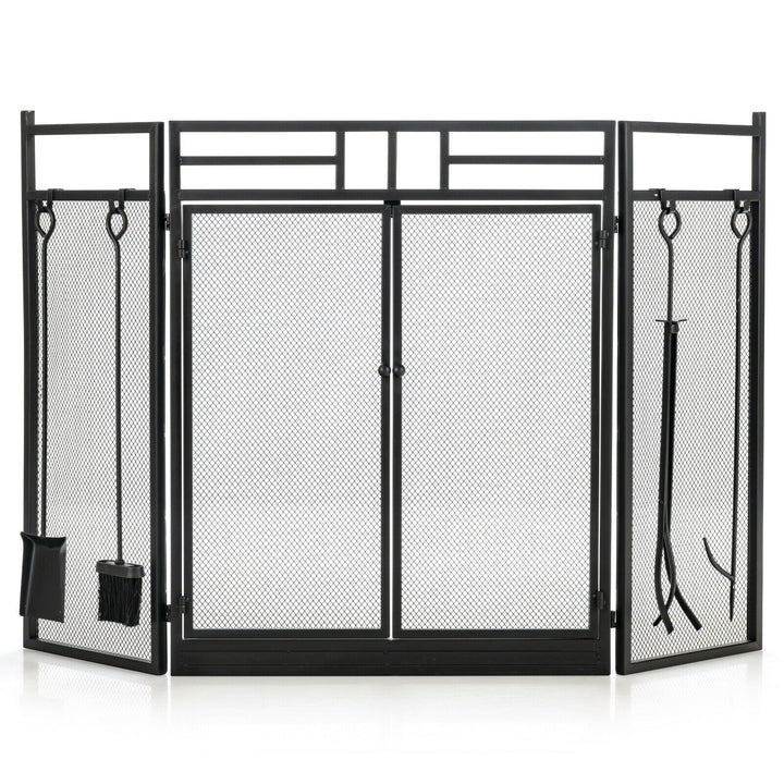 3-Panel Folding Wrought Iron Fireplace Screen with Doors and 4 Pieces Tools Set