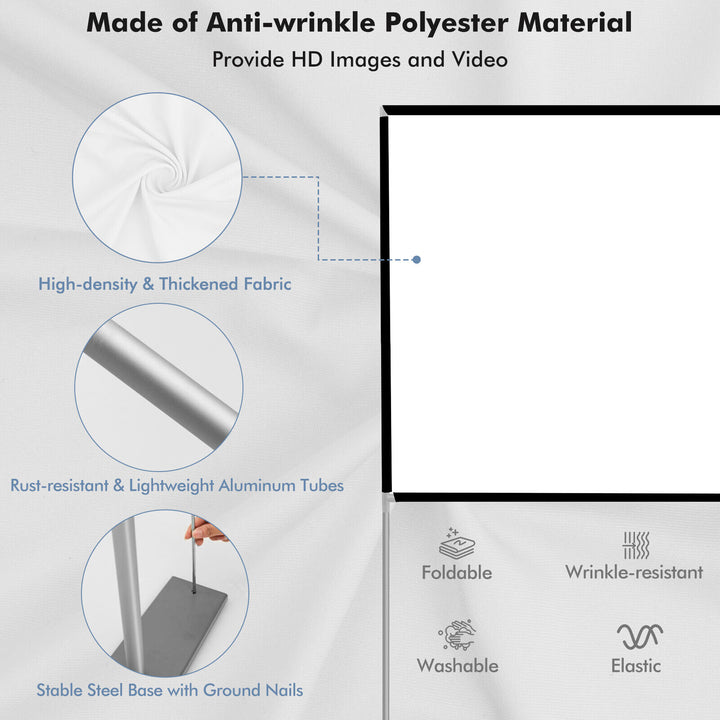 Durable, High-Quality Material: Crafted from wrinkle-resistant polyester, the screen promises a superb viewing experience without the hassle of creases or wrinkles. Its weather-resistant, foldable, and washable, ensuring longevity and easy maintenance.