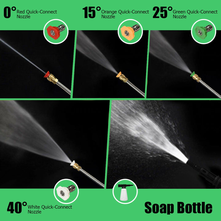 Versatile Cleaning Attachments: Adapt your cleaning approach with 4 interchangeable quick-connect nozzles (0", 15", 25", 40"), tailored for a variety of surfaces and cleaning tasks. The added soap bottle allows for the use of detergents or disinfectants, making deep cleaning tasks more effective and convenient.