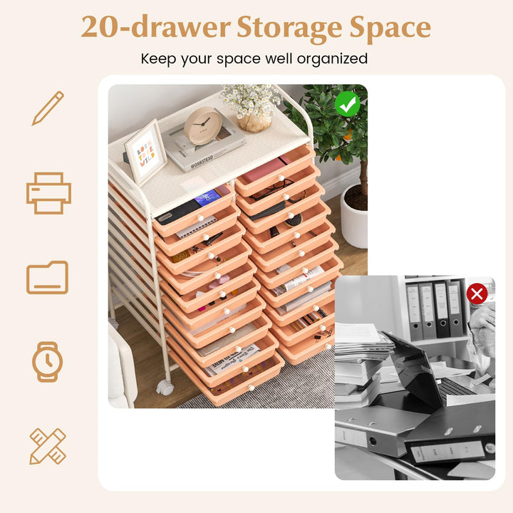 This 20-drawer rolling storage cart offers high-capacity, two-row, 10-tier organization, featuring transparent drawers for easy sorting and visibility. Its durable, eco-friendly materials and lockable wheels ensure stability and smooth mobility. Easy to install and clean, it¡¯s perfect for keeping your space organized and clutter-free.
