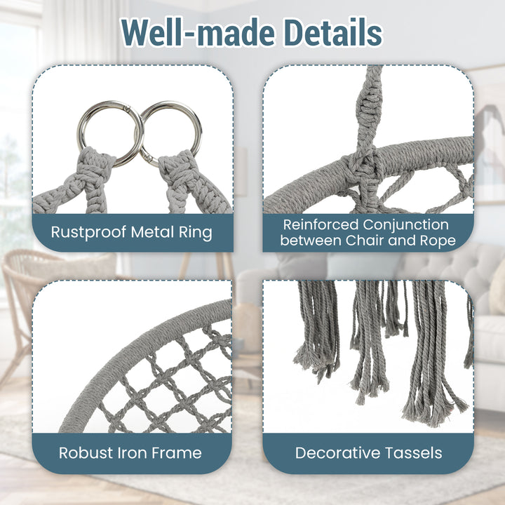 Safety and Durability: Constructed with a heavy-duty steel frame and multi-strand polyester-cotton ropes, our hammock chair supports up to 330 lbs confidently. The secure connection between the chair and ropes ensures enhanced stability and safety.