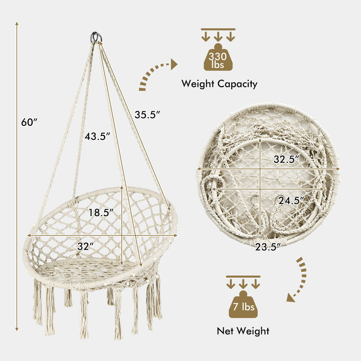 Premium Cotton Comfort: Crafted from 100% premium cotton, the hand-woven ropes offer both durability and comfort, making this hanging chair a cozy haven. The ergonomic backrest and spacious seating area are complemented by elegant decorative tassels, enhancing the chairs visual appeal.