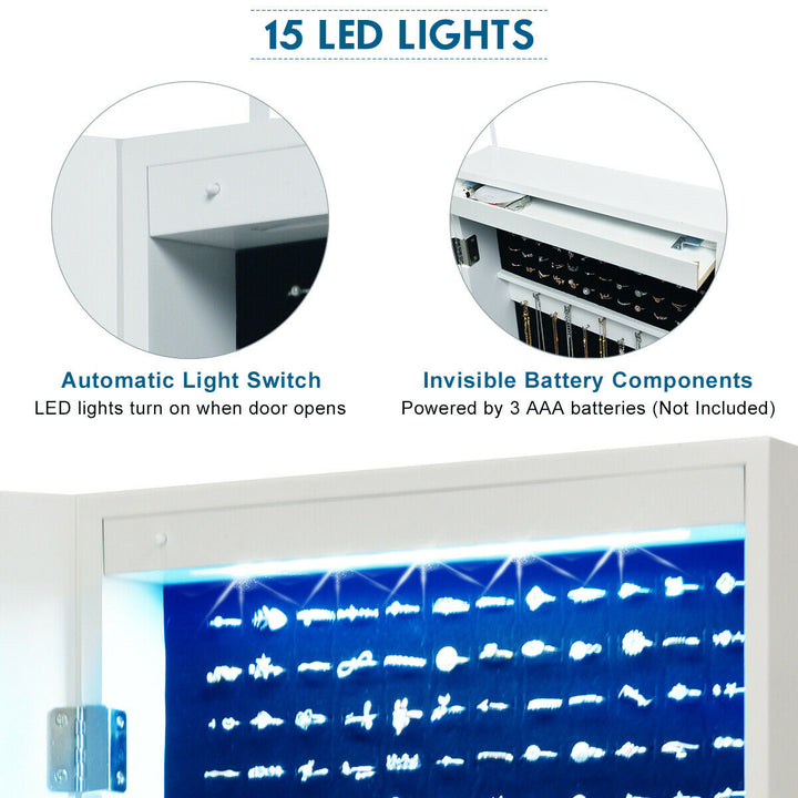 Illuminated Storage: Equipped with LED lighting powered by 3 AAA batteries (not included), this cabinet enhances visibility, allowing you to effortlessly select jewelry in a well-lit environment, adding a bright touch to your room.