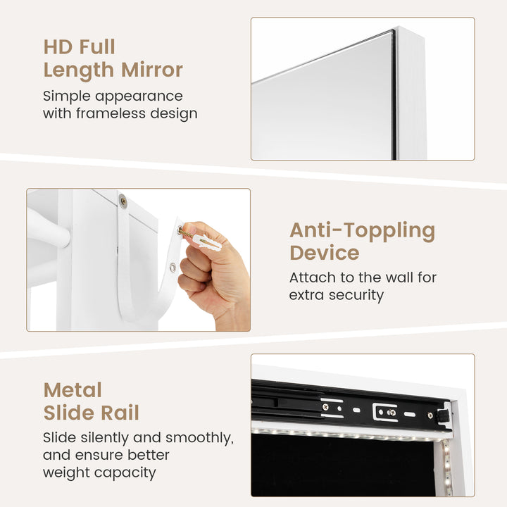 Sturdy and Secure: Comes with an anti-toppling device for wall attachment, ensuring stability and safety. The metal slide rail allows for silent and smooth operation of the jewelry cabinet door, supporting a greater weight capacity.
