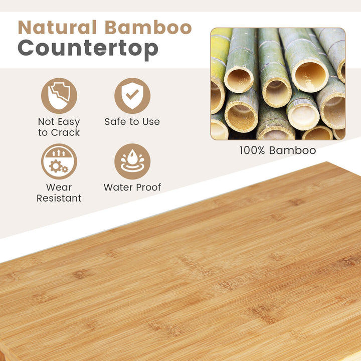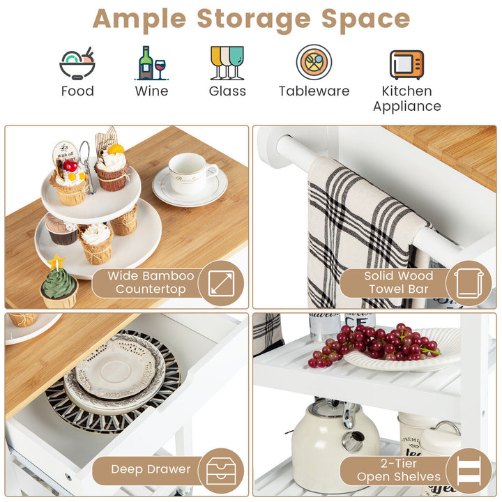 Versatile Storage Options: Equipped with a wide bamboo countertop for meal preparation or serving, 2-tier open shelves for easy access to kitchen essentials, and a deep drawer for additional storage. This cart is designed to accommodate everything from wine and food to glassware and appliances, ensuring your kitchen stays organized and clutter-free.