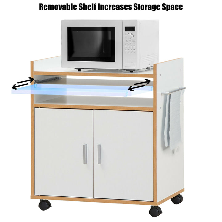 Ample Storage Options: Equipped with 3 shelves, a wide tabletop, and a double door cabinet, this kitchen cart provides versatile storage for your toaster, spices, dishes, microwave, dinnerware, pans, pots, and kitchen utensils. Organize your kitchen essentials efficiently and keep your space clutter-free.