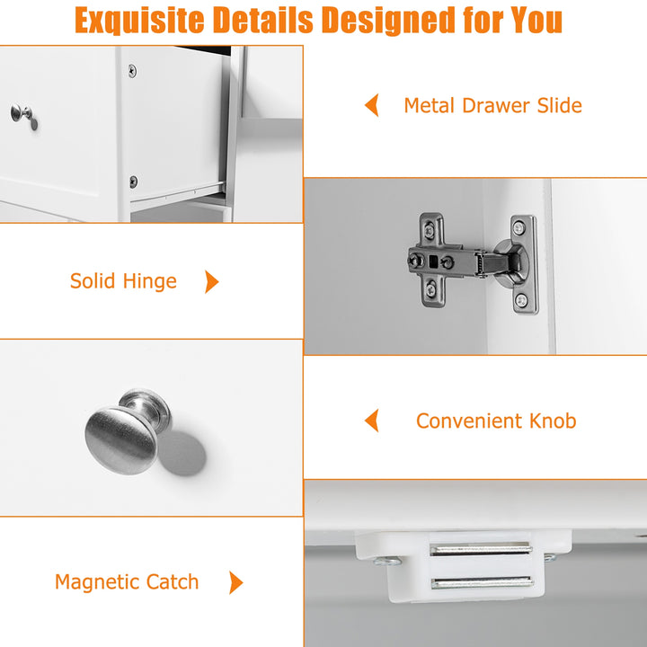 Elegant Design and Versatile Aesthetic: Beyond its practical features, this kitchen cart boasts an elegant design that harmoniously blends with a variety of decor styles. Its clean, white appearance adds a touch of charm and sophistication to your kitchen or dining area, enhancing the overall beauty of your home.