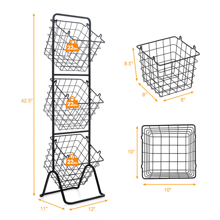 Simple Assembly: The stand is easy to assemble, with clear instructions provided. Once assembled, it measures 12" x 11" x 42.5" (L x W x H), with each basket measuring 10" x 10" x 8.5" (L x W x H), making it a practical addition to any home.