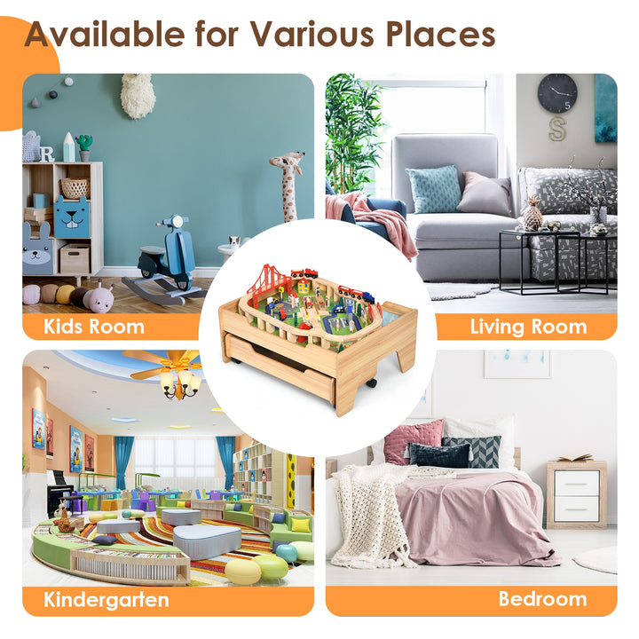 Childrens Wooden Railway Set Table with 100 Pieces Storage Drawers