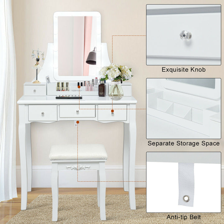 10 Dimmable Light Bulbs Vanity Dressing Table with 2 Dividers and Cushioned Stool