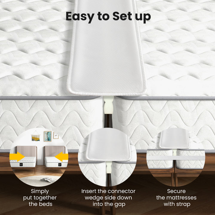 Simple Assembly Process: Assembling your new king-size bed is a breeze with our mattress connector. The straightforward process involves positioning the twin beds together, placing the connector wedge into the gap, and securing the mattresses with the provided strap. Convert your beds in minutes with no tools required.