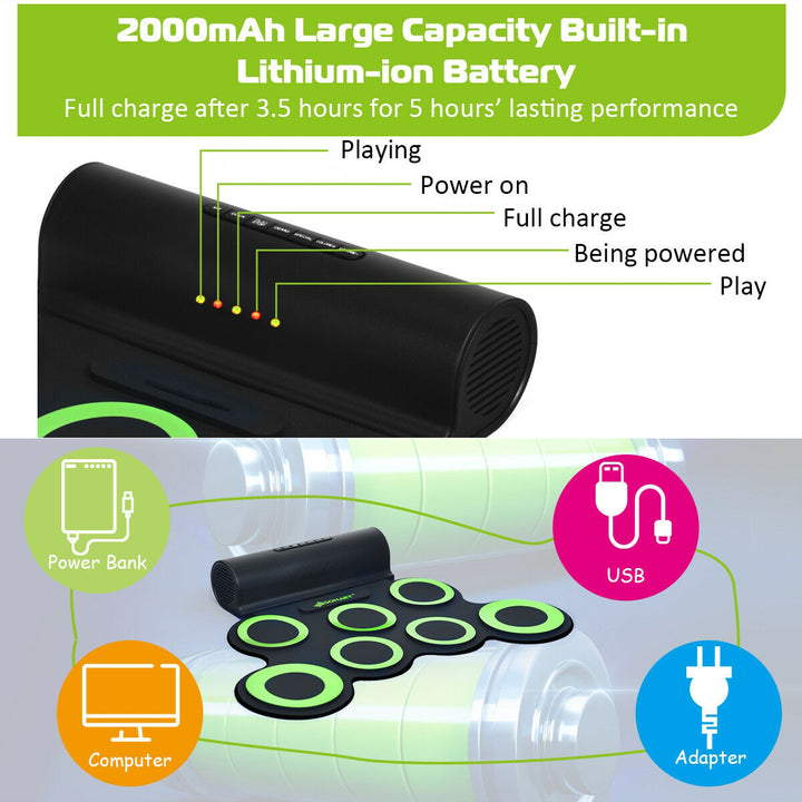 Portable and Convenient: The roll-up design of this drum kit makes it incredibly space-efficient and portable. Store it in a bag and take it wherever you go, thanks to its lightweight design and the 2000mAh rechargeable battery that supports extended playtime. The headphone jack and included headphones allow for quiet practice sessions without disturbing those around you.
