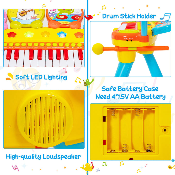 Kid-Friendly Design: Adorned with cute animal patterns and vibrant colors, the set is designed to captivate childrens interest. Soft LED lights add a magical touch to performances, creating an inviting and enjoyable atmosphere for musical exploration.