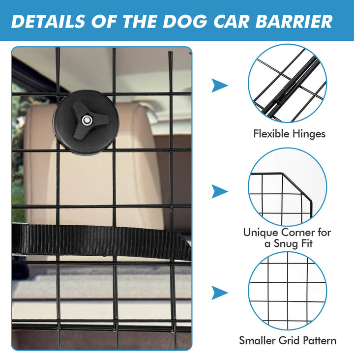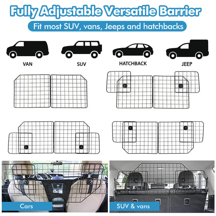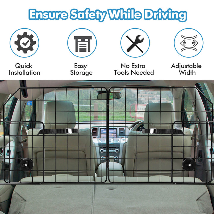 Ensure a safe and distraction-free driving experience with our Versatile Adjustable Pet Car Barrier, designed to keep your pets securely in the back of your vehicle while on the move. Tailored to fit a wide range of vehicles including SUVs, vans, trucks, and hatchbacks, this barrier adapts to your cars dimensions for optimal coverage. Crafted from durable metal mesh and equipped with strong nylon straps for secure installation, this pet car barrier is the perfect travel companion for pet owners.