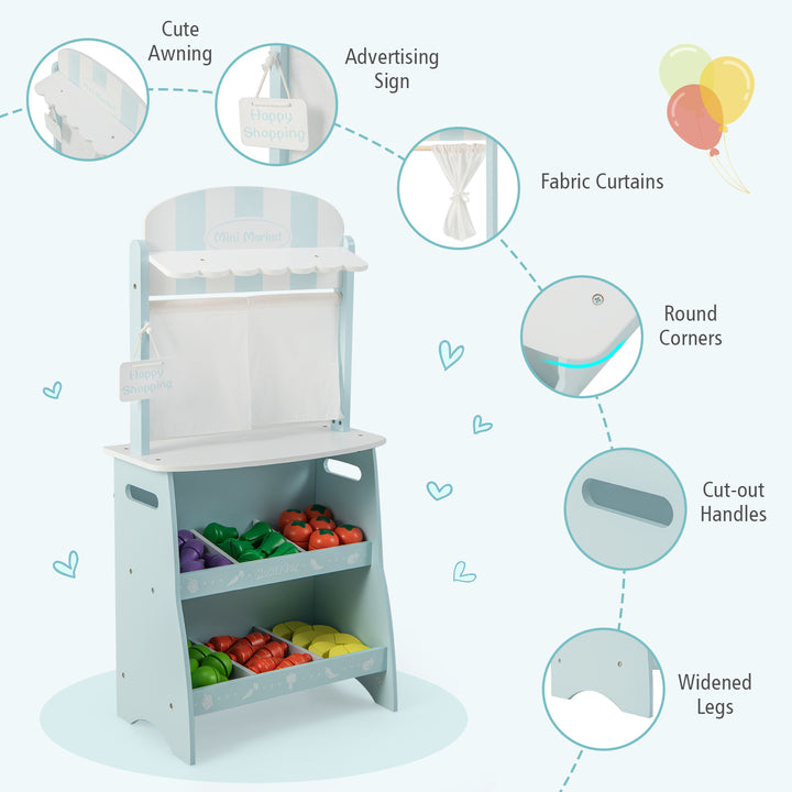 Grocery Store with Shelves: Includes two sloped storage shelves for displaying the play food, encouraging organizational skills and imaginative play.
