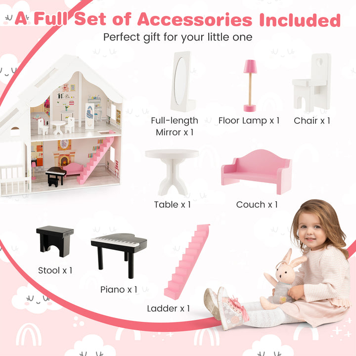 Educational and Interactive Play: Measuring 32" x 12" x 34" (L x W x H), the dollhouse offers a spacious area for individual or group play. It encourages hands-on activities, stimulates social skills through shared play, and enhances parent-child interactions, making it much more than a mere toy.