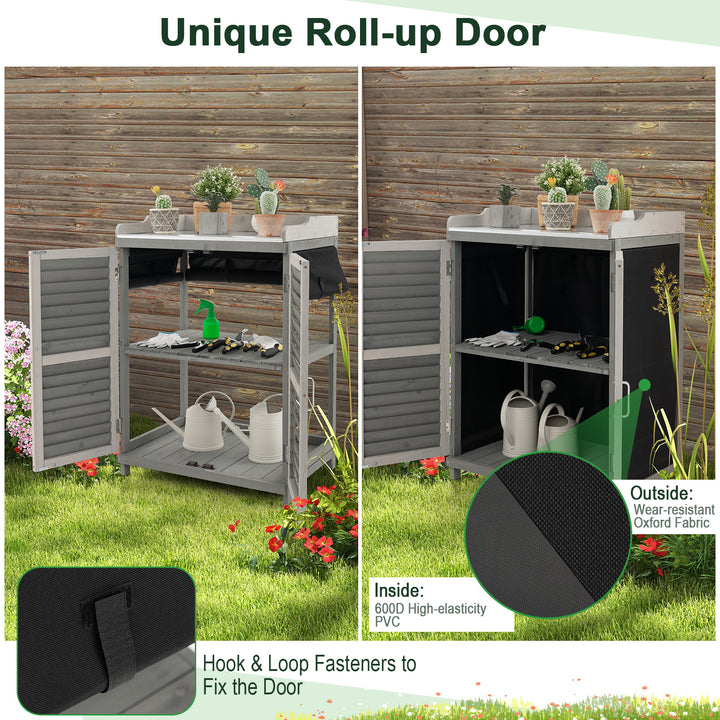 Features: Rust-Resistant Metal Top, Roll-up Doors, Louvered Front Door, Ergonomic Height