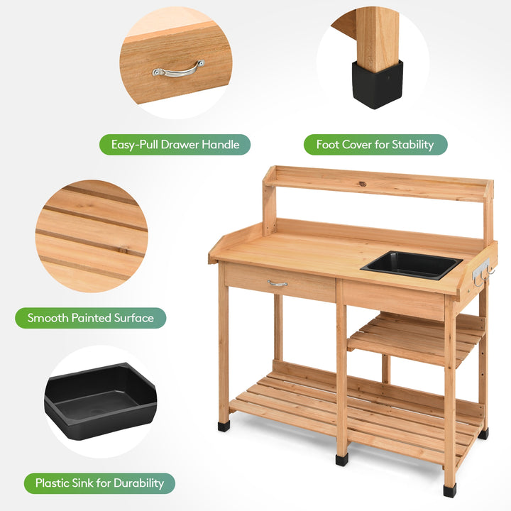 Ample Storage Space: Equipped with a top shelf, a roomy tabletop, a convenient sink, one drawer, 2-tier shelves, and 3 hooks, our potting bench ensures all your gardening tools and supplies are organized and within reach. The open shelves and hooks are especially handy for quick access to tools and hanging items like towels.