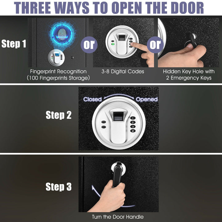 Multiple Quick Access Methods: The safe integrates an advanced fingerprint recognition system, capable of storing up to 100 fingerprints. This allows for rapid access while ensuring security. For added convenience, it includes a digital keypad for custom passwords ranging from 3 to 8 digits and two emergency keys, ensuring youre never locked out.