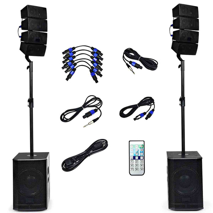 Complete Professional Setup: This set includes 1 active and 1 passive subwoofer, 8 array speakers, 2 adjustable stands, a variety of cables, a remote control, and a user manual. Designed for stellar performance, it offers an exceptional price-to-performance ratio that meets the needs of demanding audio environments.