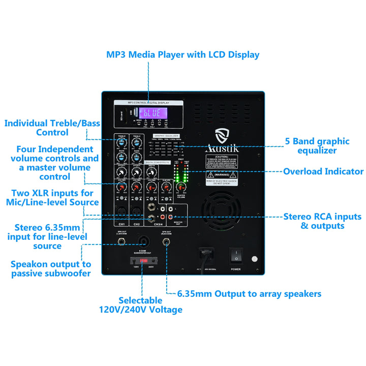 The Akustik 4000 Watt Powered Array Speaker Set stands out as the ultimate choice for those seeking to deliver professional-grade sound quality. Whether you¡¯re a DJ, a musician, or an event organizer, this speaker set will ensure that your audience is immersed in clear, deep stereo sound at every performance.