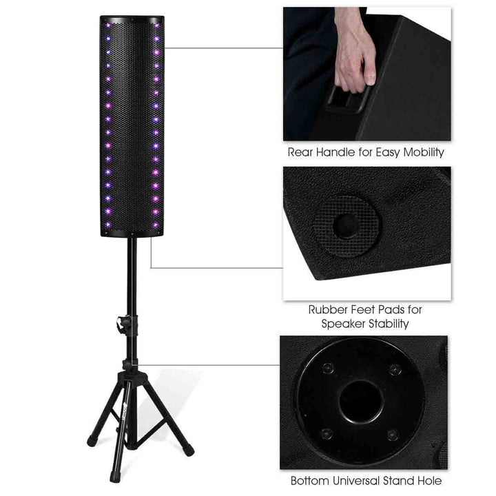Portable and Ready to Go: Designed with ease of mobility in mind, this speaker features an ergonomically shaped handle for easy transport. Pre-set up and equipped with a universal stand hole, its ready to elevate your sound experience wherever you go¡ªground placement or tripod stand, the choice is yours.