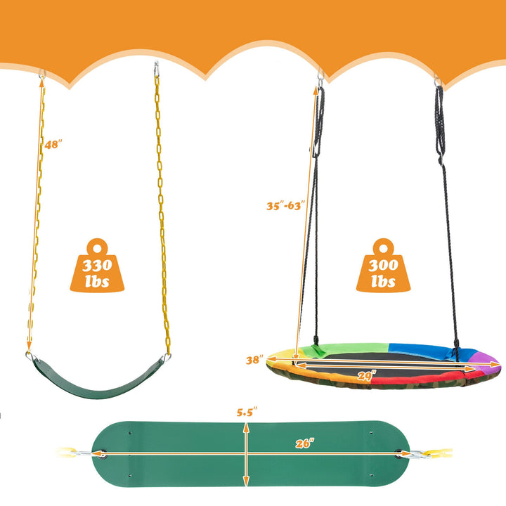 Dual Swing Options for Varied Fun: Equipped with both a belt swing and a saucer tree swing, this set offers kids different ways to play and explore, catering to various ages and interests. The inclusion of two types of swings ensures that kids can enjoy swinging alone or with friends, fostering social interactions and physical activity.