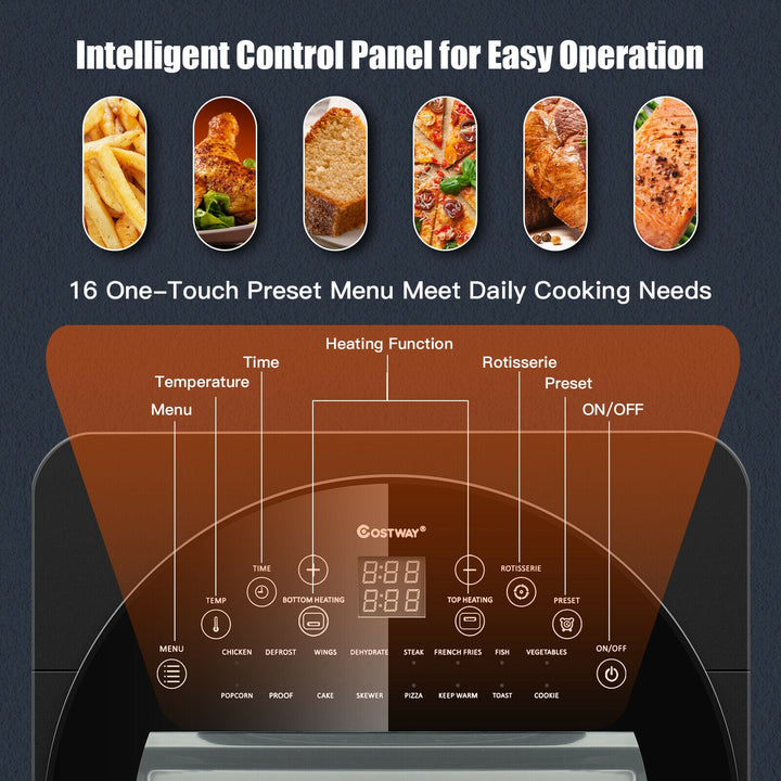 Unparalleled Cooking Versatility: Our air fryer oven features 16 pre-set cooking options, including Cake, Chicken, Fish, Pizza, Steak, Toast, Proof, Wings, Cookie, Defrost, Skewer, Popcorn, Vegetables, French Fries, Keep Warm, and Dehydrate, catering to every craving and cuisine preference.