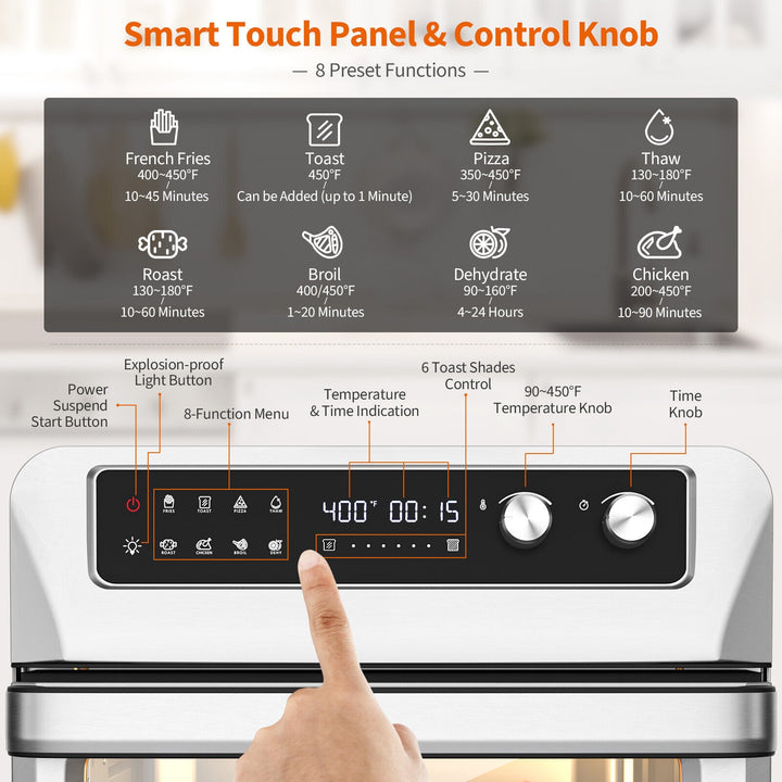 Versatile Cooking Modes: Select from an array of cooking options including fries, toast, pizza, thaw, roast, chicken, broil, and dehydration. This multifunctional appliance is your gateway to exploring a wide range of culinary delights, making it a quintessential component of your kitchen.