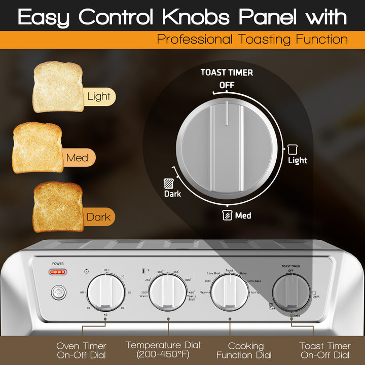 User-Friendly Controls: Four intuitive knobs offer easy temperature adjustments, mode selections, and timer settings. Equipped with an inner light and a see-through door, monitoring your cooking has never been easier. For added safety, the oven automatically shuts off when the door is opened during operation.