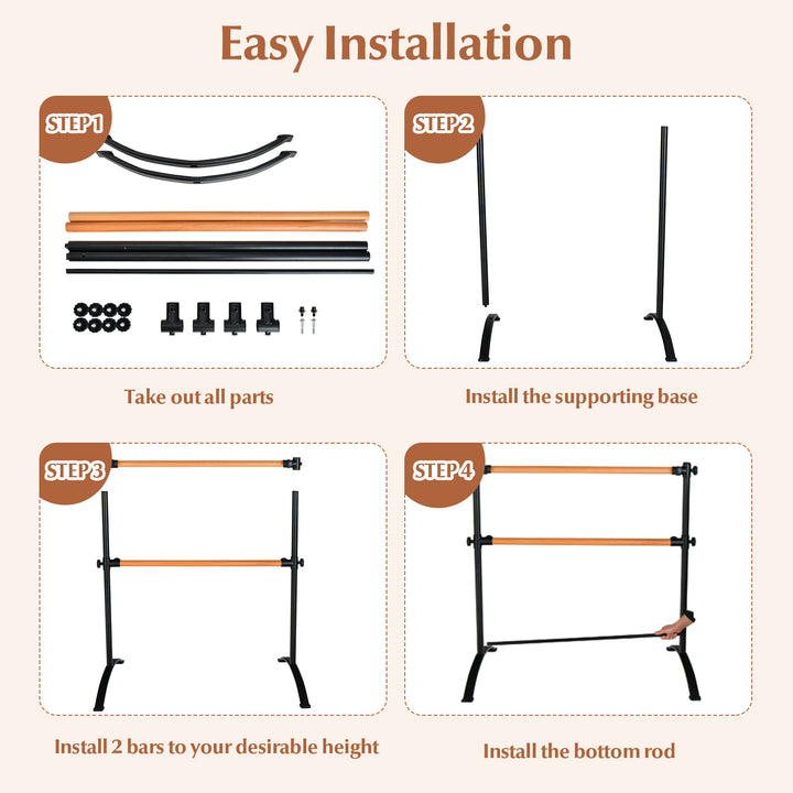 Versatile Height Adjustability: With double bars that feature four adjustable heights, this ballet barre caters to the needs of both children and adults. Adjustments are made simple by rotating the double-safety locking knobs, allowing you to set the barre to your preferred height effortlessly.