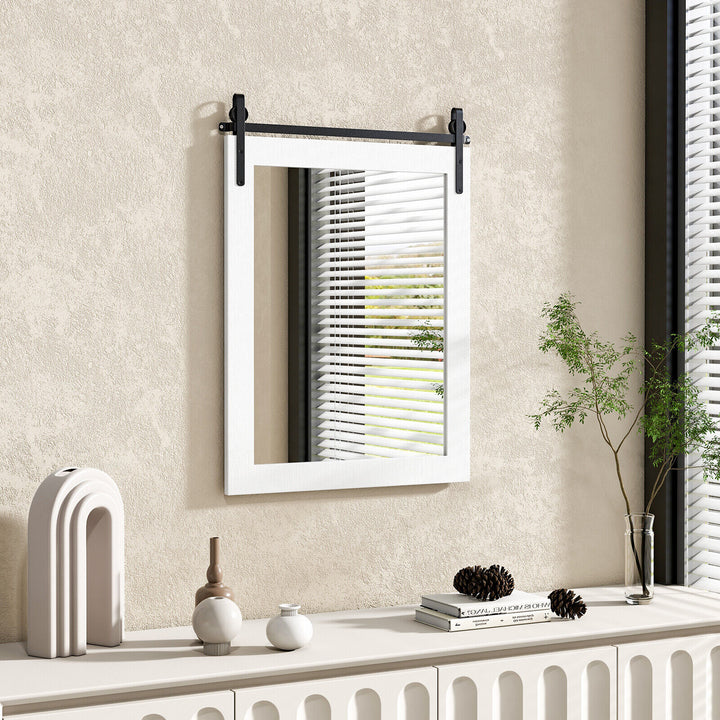 Farmhouse and Rustic Aesthetic: Embodying a blend of farmhouse charm and vintage style, the barn door-inspired design and rustic wood grain finish of this mirror add a touch of warmth and character to any space. The black metal bracket enhances its visual appeal, making it a standout piece.